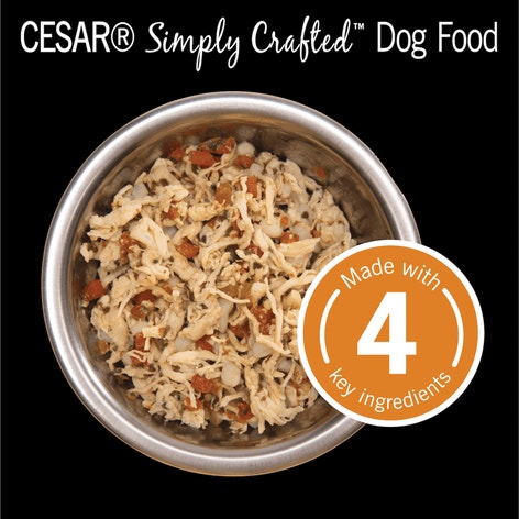 Dogs love the great taste of CESAR Wet Dog Food. CESAR SIMPLY CRAFTED Complements Tubs were designed to give dogs a simple and tasty meal complement. Add our real chicken and wholesome, quality-ingredient moist dog food recipes to any complete and balanced meal as a healthy topper. SIMPLY CRAFTED is designed with no artificial colours, flavours, fillers, or preservatives, and is always served in convenient tubs with no-fuss, easy peel freshness seals, making meal-time easy. The CESAR Brand is always looking to unlock more shared moments of joy between you and your furry friend.
