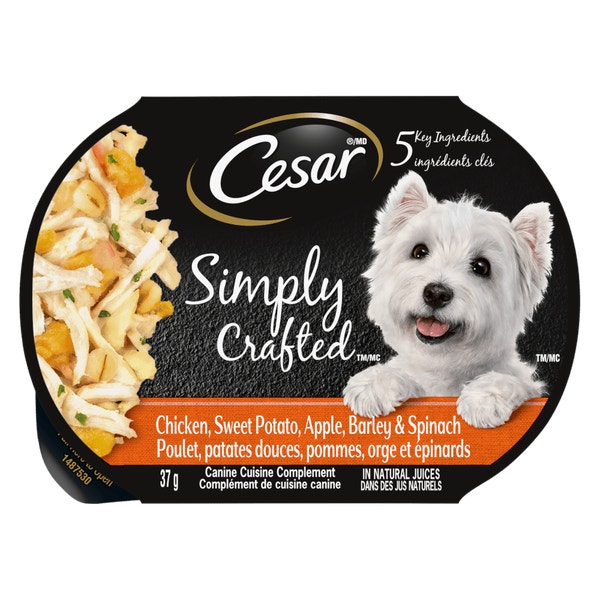 Contains one (1) 37g tub of CESAR SIMPLY CRAFTED Adult Wet Dog Food Chicken, Sweet Potato, Apple, Barley & Spinach