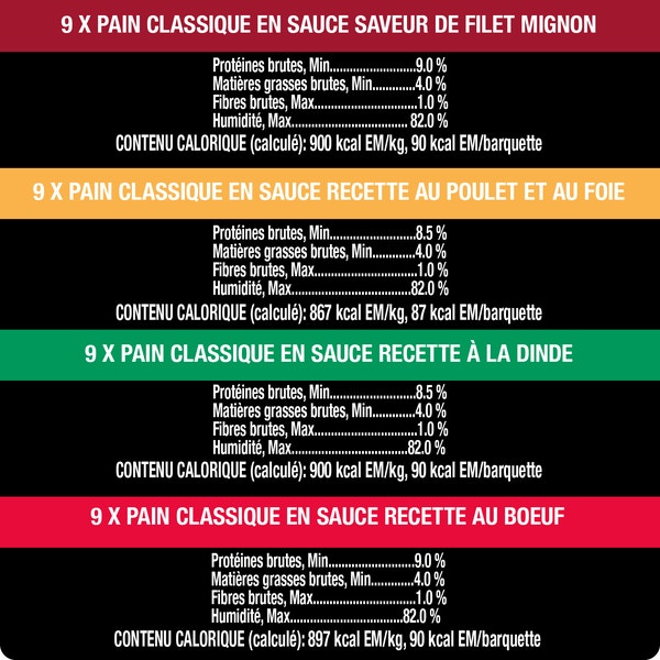 Ce pain de viande à la texture de pâté est complet et équilibré du point de vue nutritionnel, en plus de constituer une source d'humidité pouvant être bénéfique pour les petits chiens. Offrez à votre petit chien une alimentation plus diversifiée en optant pour notre pratique emballage assorti de 36 barquettes contenant ces exquises variétés : recette à la dinde, recette au poulet et au foie, recette au bœuf et saveur de filet mignon!